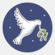 Stickers avec une colombe blanche tenant une branche d'olivier sur un arrière - plan bleu foncé. Idéal comme enveloppe scellée pour les invitations de Noël et les cartes de voeux.