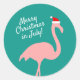 Noël en juillet flamand rose Santa Claus Classic Round Sticker. Mignons autocollants et scellés d'enveloppe. Ajoutez vos propres saisons de voeux ou de message de vacances. Amusant design d'oiseaux tropicaux.
