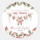 Ajoutez une touche de finition festive à votre célébration avec ces adorables autocollants de baby shower de Noël. Parfaits pour sceller des enveloppes, décorer des sacs de faveur ou personnaliser la décoration de la fête, ces autocollants ronds sont dotés de feuilles sacrés d'aquarelle, de baies, de sucres de canne, d'ornements et d'une ligne de vêtements pour bébé douce avec pyjamas de Noël, bottes et chapeau de Père Noël. Customisés avec le nom et la date de l’événement de la maman-to-be, ces stickers de baby shower de vacances sont une façon pratique mais élégante de cravate ensemble votre joyeux petit thème de baby shower.