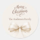 Un arrière - plan crème, beige et arc. Joyeux Noël est écrit avec un élégant script de style manuscrit. Personnalisez et ajoutez votre nom de famille. Mocha, texte de couleur marron muet.