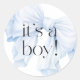 Une idée de cadeau mignon pour une baby shower ou pour célébrer la naissance d'un bébé garçon, ce design d'autocollant rond présente un grand nœud bleu aquarelle incliné sur le côté. Un texte élégant indique "c'est un garçon !" dans une belle police d'écriture. Les autocollants sont disponibles en 2 tailles : présentés ici dans la plus petite taille de 3,8 cm de diamètre, ils sont également disponibles en taille de 7,6 cm de diamètre. Utilisez-les sur les cadeaux de fête, comme sceaux d'enveloppe sur vos invitations, et plus encore !