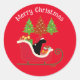 Sticker rond rouge classique noir Silhouette de Noël du Labrador. Black Labrador assis sur Père Noël Sleigh dans la forêt. Créé par Naomi Ochiai.