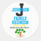 Personnalisée avec (n'importe quel nom) et (n'importe quelle date) la célébration de la réunion de famille est ce qui est parfois une fois dans une vie. Polices en gras noir, bleu et jaune sur un arrière - plan blanc. Célébration de nos racines en écriture noire avec un arbre de famille en dessous.