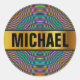Ce design d'autocollant rond comporte un motif qui regarde les yeux et qui comporte de nombreux cercles/anneaux de différentes couleurs. Il comporte également un nom personnalisé dans une zone de couleur faux or.