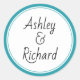 Sobre turquoise et blanc mariage Classic Round Sticker. Il affiche vos noms sur blanc avec une bordure turquoise. Il coordonne avec notre collection de mariages "turquoises feuilles tropicaux".