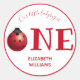 Sticker pour votre première fête d'anniversaire sur le thème de la coccinelle. Il inclut les mots "Notre petite coccinelle est une" avec le mot "un" commencé avec une illustration de coccinelle. Ces autocollants comprennent également un nom personnalisable.
