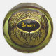 Cet autocollant effrayant d'Halloween présente un gros plan de l'oeil d'une grenouille verte. Son iris est un incroyable motif abstrait d'or et de jaune. La pure pupille ovale noire au centre reflète les arbres au loin. Le texte dit : Attention ! Il peut être customisé ou supprimé.