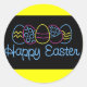 Ce design présente des oeufs décorés dans des tons néons rose, jaune, violet et bleu. Happy Pâques est imprimé sur le fond de ce dessin. Un dossier est appliqué à l'arrière. Ce design est présenté avec des arrière-plans colorés différents, ou de créer votre propre arrière-plan.