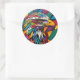 OEuvre d'aigle vibrante et colorée. La tête de l'aigle est dépeinte dans un style frappant avec des couches de formes audacieuses et géométriques et des couleurs vives, dont les rouges, les bleus, les verts et les jaunes. Les plumes sont stylisées avec des détails complexes, présentant une variété de nuances qui créent un sens de profondeur et de mouvement. L'arrière - plan se compose de motifs géométriques de couleur similaire qui améliorent la composition dynamique globale. L'oeil piercing de l'aigle ajoute un point focal intense à la pièce, transmettant force et majesté.