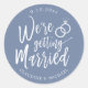Un autocollant unique Pigeon Blue et blanc minimaliste écrit spécialement adapté à votre fête ou événement mariage post-mariage. Il comporte le mot "Nous nous marions" avec des anneaux mariages se reposant au-dessus. En dessous de cela et au-dessus il y a les noms de la future mariée et mariée et la date mariage.