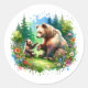 Un ours maman joue avec son bébé ourson dehors dans un champ d'herbe et de fleurs avec un arrière - plan de pin. Aquarelle style art.