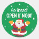 Un autocollant de Noël amusant avec Père Noël disant Aller de l'avant Ouvrir maintenant est idéal pour un paquet cadeau que vous voulez recevoir à ouvrir immédiatement, comme un cadeau de nourriture ou de pâtisseries.