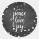 Profitez de cet autocollant de vacances avec les mots paix amour et joie superposés sur un tableau noir avec des étoiles décoratives.