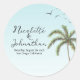 Ces étiquettes autocollants personnalisés ont un thème tropical pour une destination ou un simple mariage sur la plage. Une image de palmier est photographiée à droite, avec un troupeau d'oiseaux volant au-dessus. L'arrière - plan est un dégradé bleu ciel. Les noms du couple sont imprimés sur la gauche dans une police de script élégante, suivie de la date et de l'emplacement du mariage.