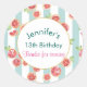 Un autocollant de remerciement d'anniversaire avec un motif numérique extensible de pamplemousse rose créé avec des aquarelles, posé sur un motif rayé vert pastel et blanc. Un cercle blanc avec une bordure de couleur or se trouve au centre et tient votre texte personnalisé.
