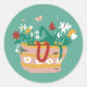 Sticker Rond Panier à fleurs - sur vert moyen.