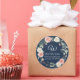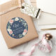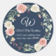 Sceau de retour d'adresse d'enveloppe rond avec votre monogramme, nom et adresse. Parfait pour ajouter une touche décorative et sceller les enveloppes pour les invitations de mariage et les fêtes de douche de mariée. Fond bleu marine avec texte blanc et aquarelle à la main rose nacrée et floral de rose ivoire avec feuillage de feuille d'eucalyptus semencé par l'artiste, Audrey Jeanne Roberts. Copyright.