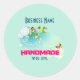 Autocollant fantaisie pour une entreprise domestique qui fabrique des articles faits à la main. Texte dit (votre nom d'entreprise) fait main avec amour. Un arrière - plan abstrait aux cercles et aux formes tourbillonnant. La couleur est apaisante, vert printemps, turquoise et jaune dans les tons pastel clairs. Quelques papillons oranges et jaunes flottent autour de fines fleurs fleuries aux branches brunes et feuilles vertes. A un printemps frais, délicieux, look magique.