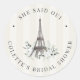 Scellez vos cadeaux de fête de mariage avec le charme parisien en utilisant cette étiquette de faveur ronde de la collection Paris Bloom par Redwood & Vine Design Co. Mise en valeur par une Tour Eiffel illustrée à la main, des fleurs douces et la phrase « Elle a dit Oui », cette étiquette est un moyen élégant de personnaliser les sacs de faveur, les boîtes de friandises ou les cadeaux lors d'une fête de mariage inspirée de la France.