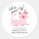 Un autocollant de fête d'anniversaire mignon et drôle pour la fête à thème de votre enfant. Illustration d'une chatte rose avec un sourire sur le visage portant un casquette de fête. Le texte ci-dessus dit : "Passez-y !" Vous pouvez ajouter le nom et l'âge de votre enfant en bas de page. Les textes sont facilement personnalisables en ligne.