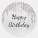Un autocollant girly et tendance pour un cadeau d'anniversaire. Un faux arrière - plan à l'aspect métallique décoré de faux parties scintillant rose goutte et le texte : Joyeux anniversaire en noir.