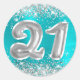 Fabuleux autocollants ronds de 21e anniversaire pour votre meilleur ami. Numéro 21 dans une image texte bulle gonflable. L'image arrière - plan présente un bleu turquoise à glam girly et une feuille en métal brossé à l'ombre cyan avec des graphismes en art numérique de parties scintillant en faux argent. Les scintillants de luxe, la parties scintillant et la feuille seront créés avec des éléments artistiques créatifs qui s'impriment comme une photo.