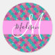 Fille et glam violet, lilas, aqua, turquoise et verte parties scintillant sirène scintillent nom monogramme et autocollant rond classique initial. Votre nom personnalisé et votre monogramme sont écrits dans un élégant script écrit à la main avec un arrière - plan rose. Un cadeau d'anniversaire ou de Noël parfait !