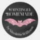 Ce étiquette autocollant personnalisé présente un thème d'Halloween mignon. L'arrière - plan présente une texture de feuille noire avec une chauve-parties scintillant rose au centre. L'expression "Hauntingly Homemade" est imprimée en haut dans une police fantaisiste. Un exemple de nom est imprimé en bas, que vous pouvez personnaliser pour inclure votre propre nom ou texte personnalisé.