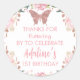 Sticker rond classique pour papillon rose parties scintillant Anniversaire sur thème papillon doux autocollant de fête d'anniversaire avec deux arrangements floraux rose aquarelle, faux papillon parties scintillant rose et quelques textes de calligraphie.