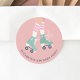 Un autocollant pastel rose patinage d'anniversaire avec une illustration retro de patins à rouleaux turquoises sur une fille portant des chaussettes à tube rayé rose. Ajoutez son nom de typographie bleu turquoise foncé.