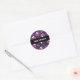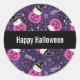 stickers Halloween avec un adorable motif à thème Halloween. Chats en casquette sorciers, assis sur des citrouilles roses avec des toiles violettes dans l'arrière - plan.