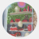 Tableau à l'huile d'origine par Susan Payne-Trutna d'une vitrine de Pâques d'une boutique gourmande, Paul Lamotte à Fontainebleau, France. OEufs au chocolat et boîtes rouges brillantes contrastent merveilleusement avec les reflets vert feuillus et bleu des fenêtres...