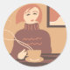 Illustration d'une dame assise à une table buvant une tasse de café ou de thé chaud.
