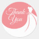 Douche mariée rose rose rose, merci sticker rond classique avec une robe de mariée élégante avec une belle police blanche script. Parfait pour les scellés d'enveloppe et préférez les autocollants. Vous pouvez customiser la couleur de l'arrière - plan pour la coordonner avec votre thème mariage.