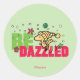 This circular Peanuts sticker is set against a soft, light green (or mint) background. The design features a large, colorful, stacked message: "BE DAZZLED," with "BE" in a lighter green and "DAZZLED" in a bold pink/red. Overlapping the text, Woodstock, the little yellow bird, is seen bundled up in a winter hat and surrounded by falling snow and stylized snowflakes. This officially licensed sticker is a bright, energetic piece of seasonal merchandise, perfect for spreading holiday cheer, decorating gifts, or adding a vibrant and charming accent to any surface during winter.