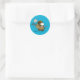 This striking, circular Peanuts sticker features Snoopy in his adventurous persona, often associated with a mountain climber or explorer. The design is set against a vibrant, solid teal or bright blue background. Snoopy is seen heavily laden, carrying a large brown backpack, a shovel, ski poles, and a pair of skis or some other winter gear across his body. He is also wearing a shaggy brown fur-like costume (a reference to his Beagle Scout leader or explorer alter-ego) and has a determined look on his face. This officially licensed sticker is a fun piece of winter sports or adventure-themed merchandise, perfect for fans who love Snoopy's various alter-egos and outdoor activities.
