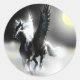 Un pegasus vole haut au-dessus des nuages brillants pendant une nuit éclairée par la lune, sans les soucis et les soucis qui peuvent descendre sur le sol. Derrière lui la pleine lune brille et rend la créature mystérieuse. Est-ce un pegasus blanc jeté dans des lumières profondes et des ombres ou un cheval noir avec des points éblouissants de réflexion blanche. Ou est-ce, en vérité, un animal applaudi. Dans ce contexte, nous ne le saurons peut-être jamais.