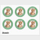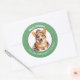 Une image d'un adorable chien de Pembroke Welsh Corgi portant un casquette d'hiver et une couverture assortie est au centre de cet autocollant de vacances. L'image est encadrée dans une bordure circulaire verte qui contient votre texte personnalisé en blanc. Idéal pour les cartes de Noël, la correspondance et les forfaits cadeaux.