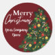 Elevate your holiday gifting with this Personalized Merry Christmas Tree Sticker, designed for businesses, events, and festive packaging. Featuring a beautifully illustrated Christmas tree, elegant script typography, and space to add your company name, this sticker is perfect for branding holiday gift boxes, product packaging, mailers, party favors, and corporate giveaways.