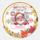 A magical and festive personalized Christmas sticker that adds an authentic North Pole touch to any gift! This large, round label features a classic, cheerful Santa Claus surrounded by glittering gold holly, snowflakes, berries, and beautiful red and white poinsettias.