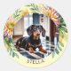 Créez vos propres autocollants avec une photo préférée de votre chien ou autre animal de compagnie, et leur nom. Votre photo choisie apparaîtra dans un cadre décoratif jaune clair avec des fleurs botaniques et des feuilles, avec leur nom sous la photo. Pour continuer, cliquez sur Personnaliser pour télécharger la photo et le texte que vous avez choisis sur le modèle.