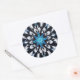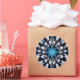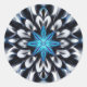 Abstrait d'une fleur aux pétales centraux bleus saphirs lumineux entourés de couches de pétales blancs, chacun marqué d'ombres noires audacieuses, ressemblant à des plumes.