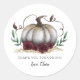 Joli et élégant petit thème citrouille fête d'anniversaire à la faveur autocollant avec un citrouille blanc avec parties scintillant en faux or et fleurs rouges bordeaux. Le texte sous l'illustration dit "Merci d'être venu !" Customisez ce produit en ajoutant le nom de votre enfant au bas. Idéal pour l'anniversaire d'automne d'une fille.