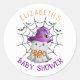 Ces adorables autocollants de baby shower présentent un mignon petit fantôme dans un casquette de sorcière violette, présentant joyeusement le mot "BOO". La toile de fond présente une toile d'araignée détaillée ornée de chauves-souris ludiques, offrant une ambiance festive et amusante idéale pour la célébration.