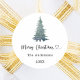 Un arrière - plan blanc, un texte vide. Décoré d'un pin vert aquarellé. Texte : Joyeux Noël. Avec un coeur. Personnalisez et ajoutez votre nom de famille et votre année.