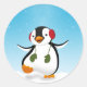 Une jolie illustration hivernale : un manchot avec des gants et un écouteur de bonne humeur marche dans la neige.