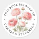 Bookplate labels featuring a painting of pink ranunculus flowers with green leaves, and customizable text "this book belongs to" and your name on a white background.