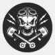 Crâne fou et pistons croisés, avec casque et lunettes en cuir et boulons éclair. Dessin original à encre B/W.