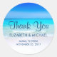 Un autocollant de remerciement mariage avec une plage de sable tropical. Une magnifique mer turquoise au loin et des eaux cristallines qui caressent une plage de sable. Un ciel bleu vif dans l'arrière - plan.