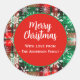 sticker de Noël avec des couleurs de Noël plaid superposées avec un motif de flocon de neige et un cercle rouge solide au milieu pour le texte. Le texte sur la balise peut être customisé avec votre propre.
